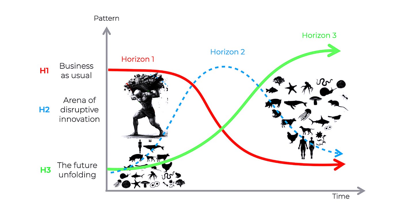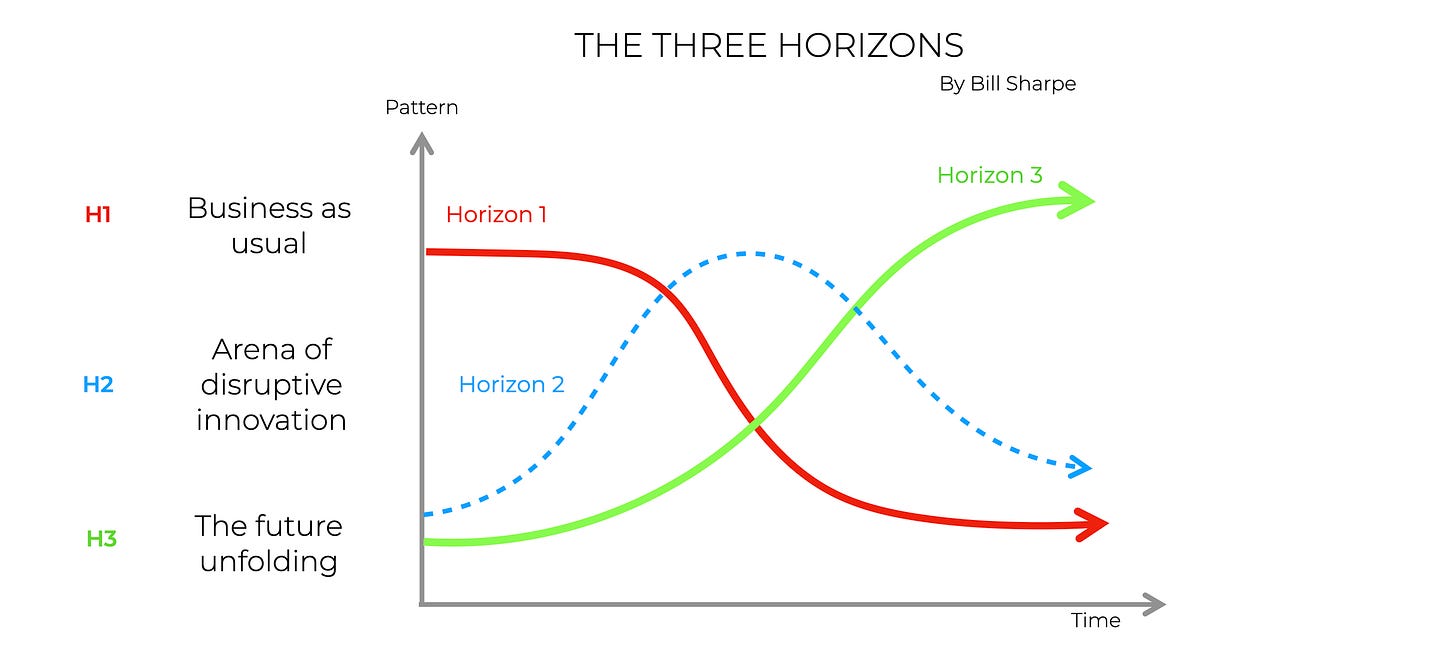 Take into account that this article is structured around the Three Horizons framework developed by Bill Sharpe. If you’re not familiar with it, I recommend exploring it. The framework helps us see how dominant systems persist, how disruption destabilizes them, and how entirely new ways of organizing life quietly emerge alongside their decline.